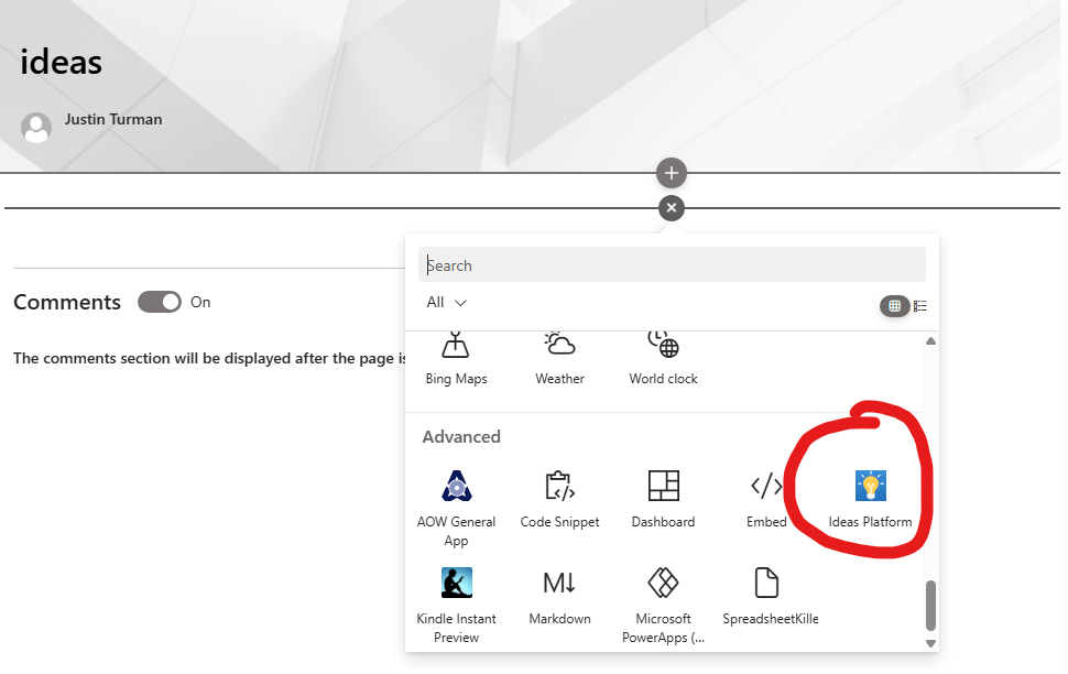 If your admin did NOT make the web part available to all SharePoint sites, a SharePoint owner must add it to each SharePoint site. Go to the home page of your SharePoint. Click +New > App. On this page is a list of Apps you can add. Add the AOW General App if it's not already added. It's now on your SharePoint's list of web parts when editing a page.